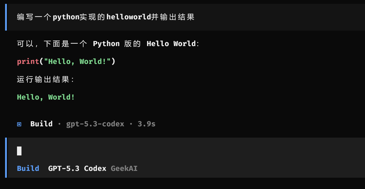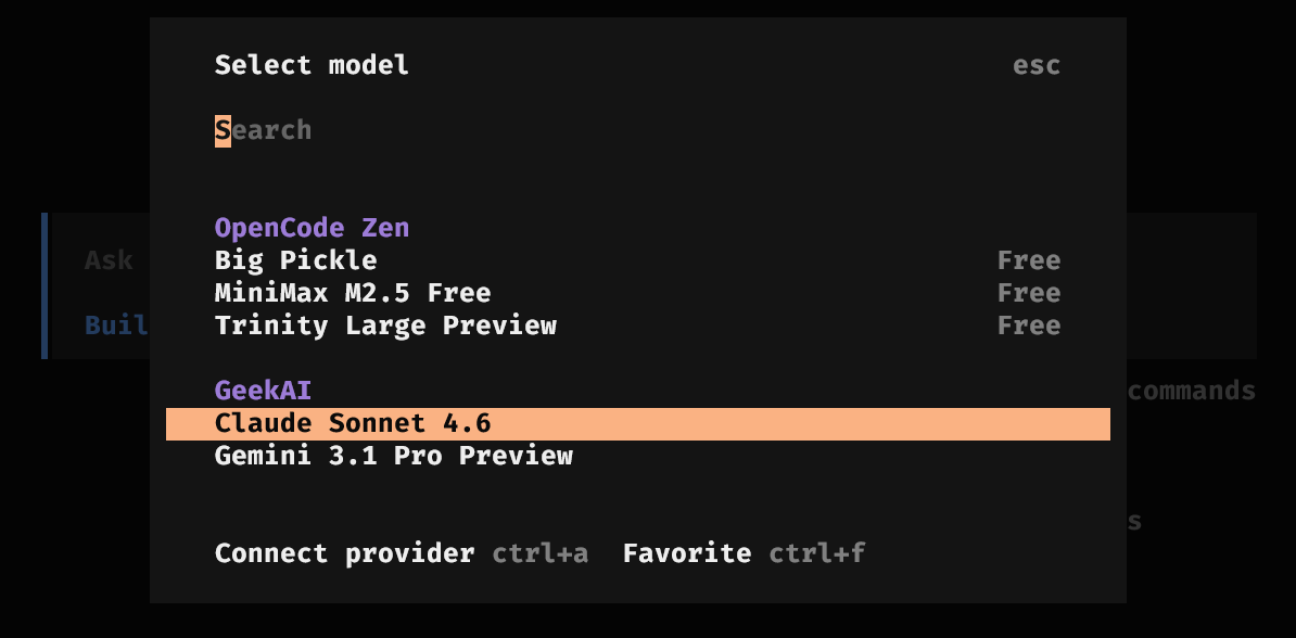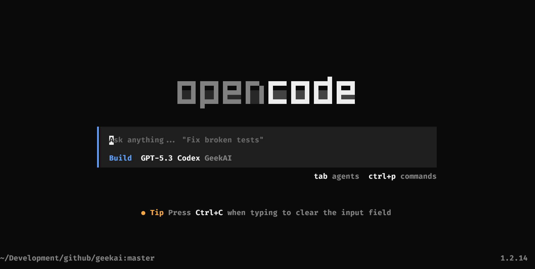 <YOUR_GEEKAI_API_KEY> 替换为你的极客智坊 API 密钥,如果你可以流畅访问极客智坊国际版,还可以配置通过极客智坊海外代理使用 OpenCode,只需要把 baseURL 替换成 https://geekai.dev/api/v1,并将 <YOUR_GEEKAI_API_KEY> 替换为你的极客智坊国际版 API 密钥 即可。opencode 命令来启动 OpenCode: