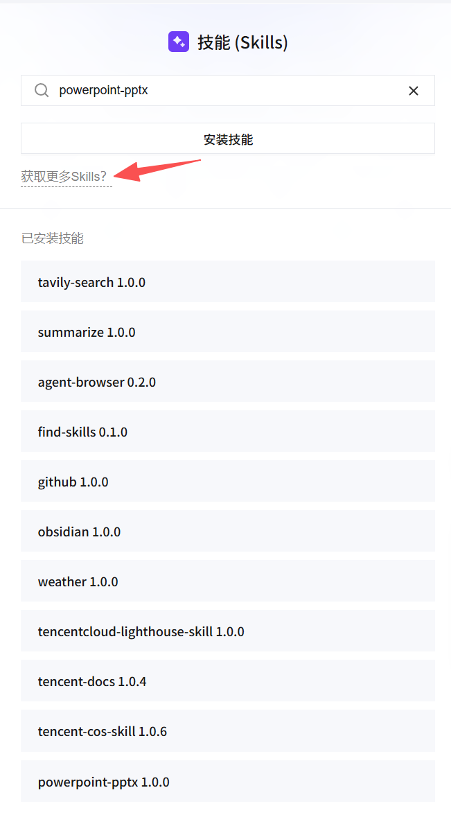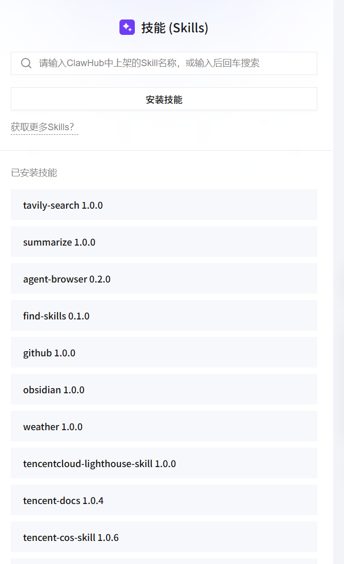 找到自己想要的skill,记住他的名称便可以返回到应用管理界面的skill面板内填写,点击安装技能即可安装完成,在已安装技能里面可以看到自己安装的skill: