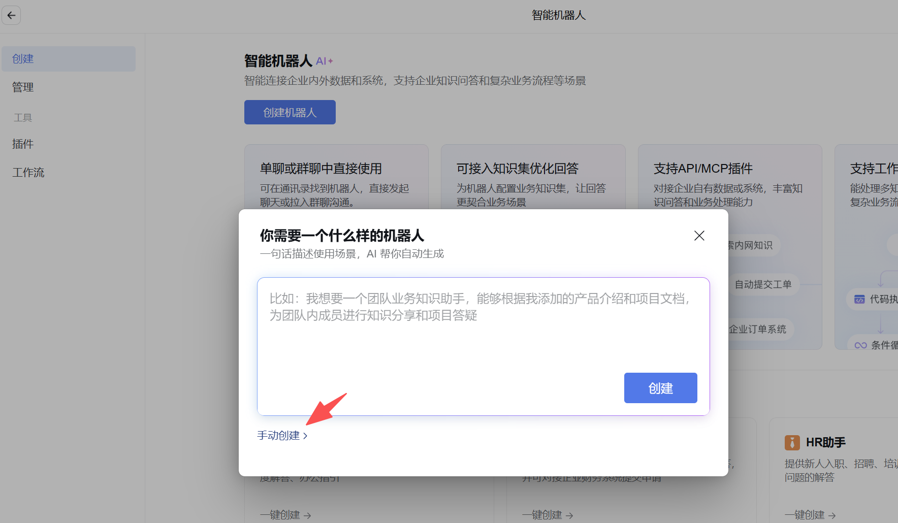 选择创建机器人,选择手动创建: