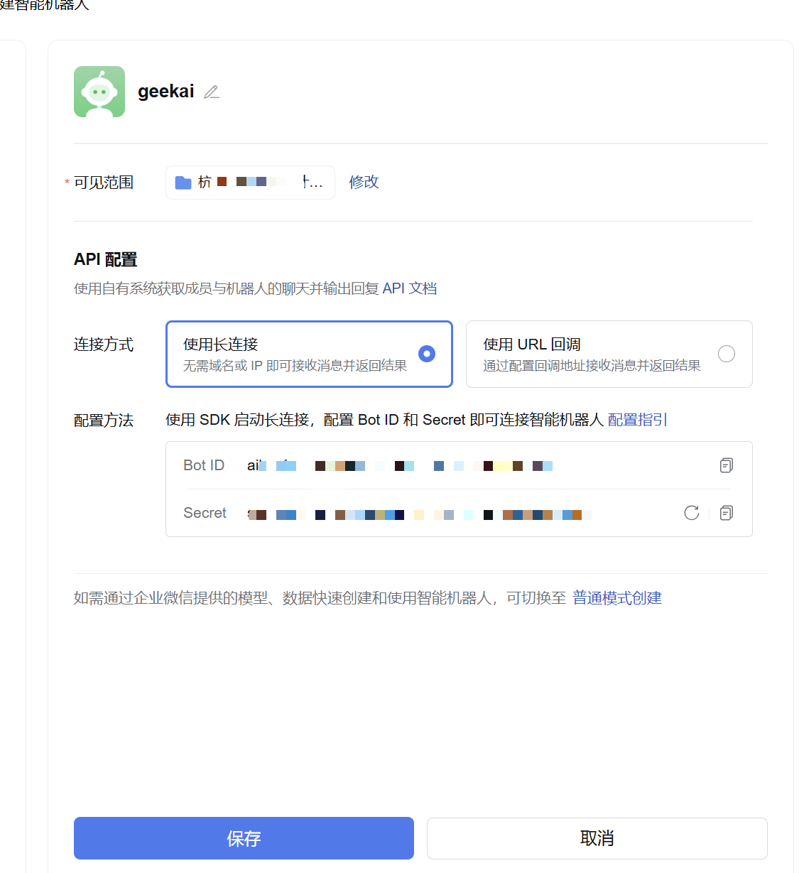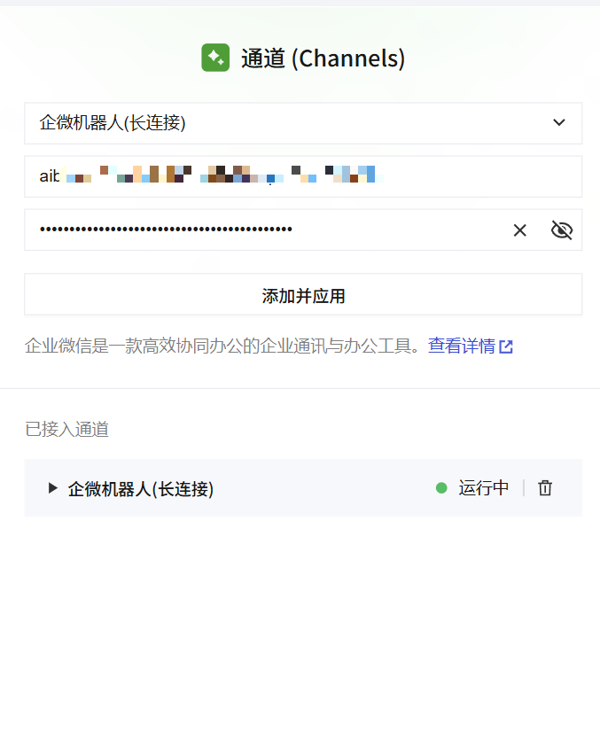 获取到Bot ID和 Secret之后,在回到应用管理界面进行通道的编写配置,之后添加并应用即可。