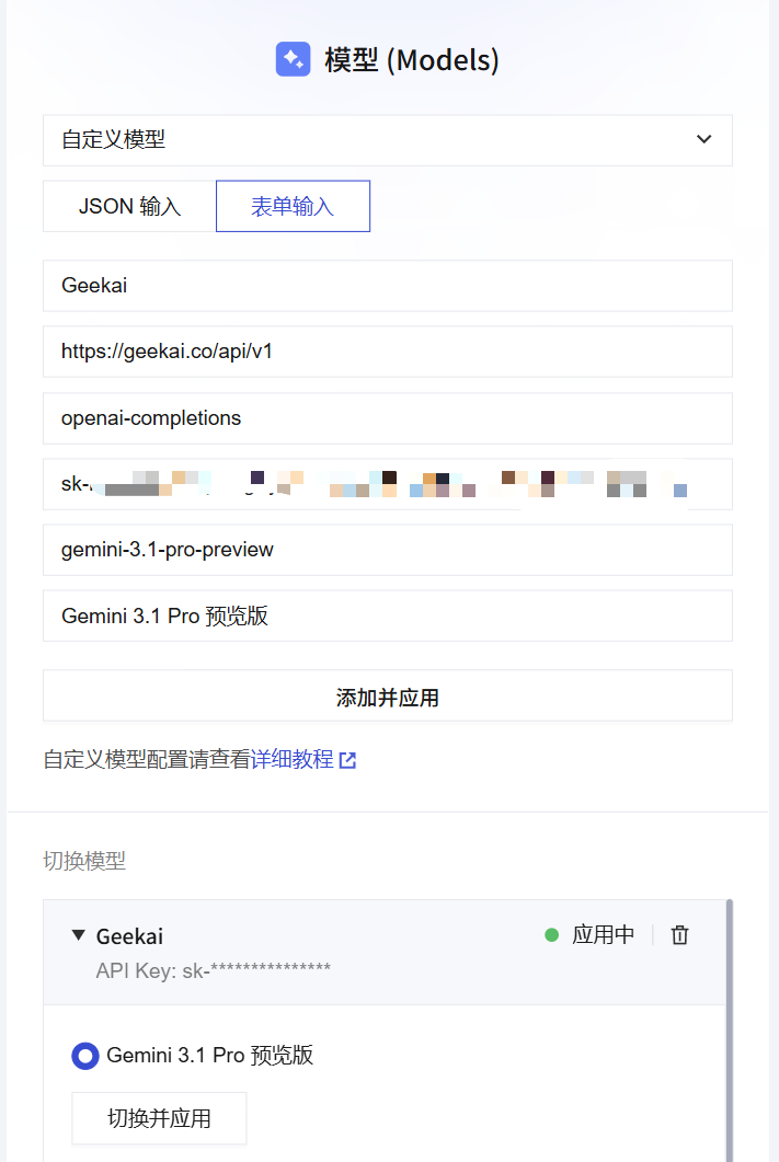 点击进入以后,点击上方的应用管理标签,我们可以在下面的模型(Models)面板内填写极客智坊的接信息,选择自定义模型,然后按照如图所示的格式进行填写: