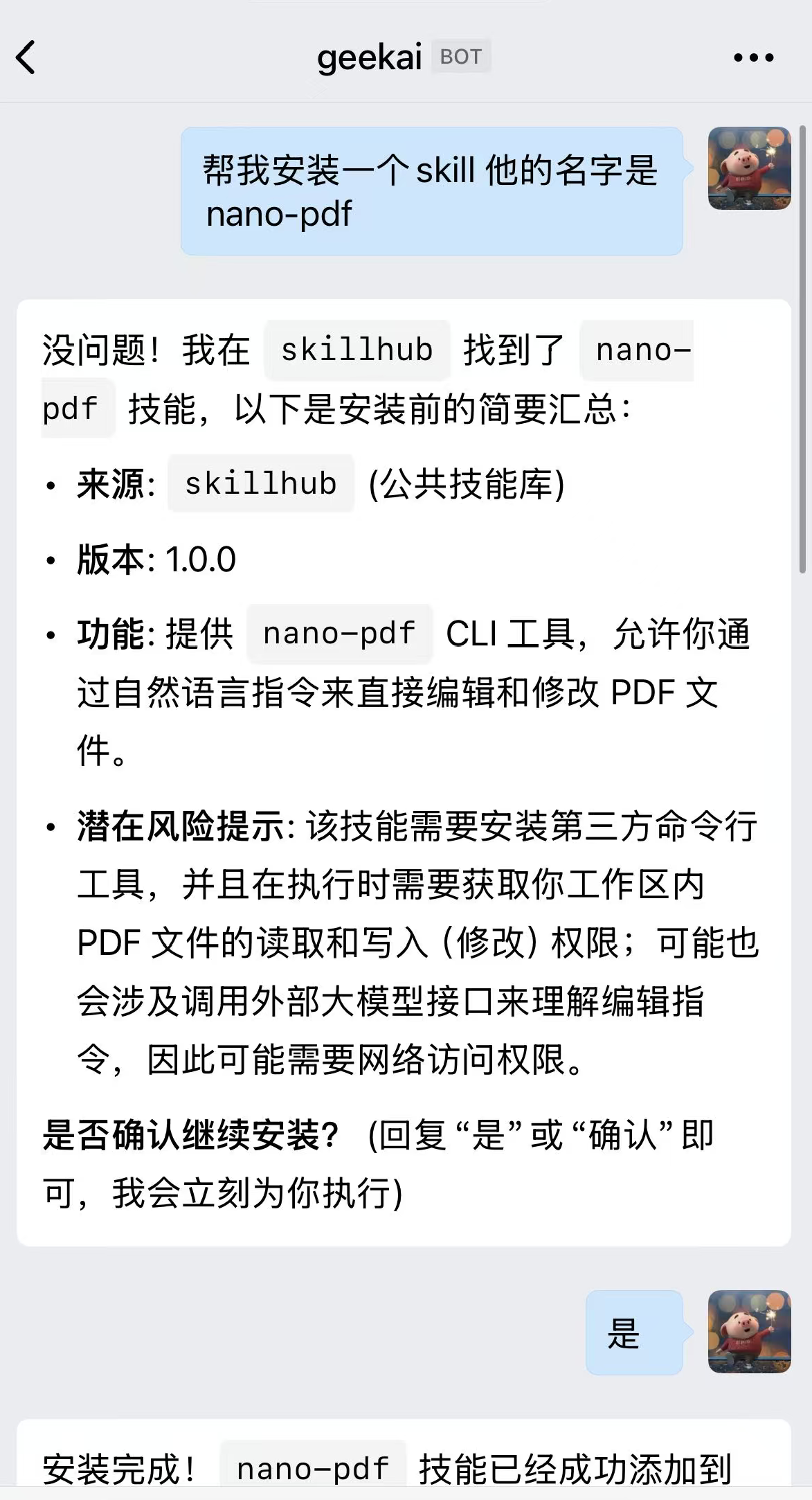 或者,你也可以通过和openclaw的聊天,进行技能的安装: