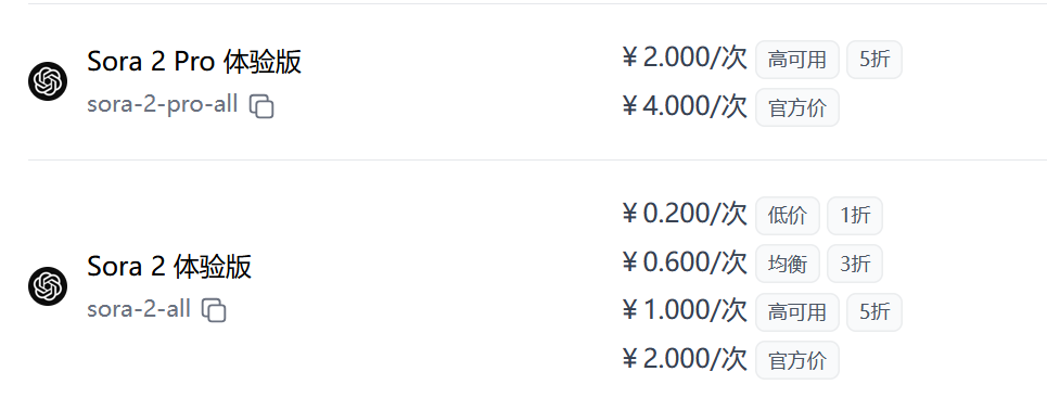 Sora 2 体验版和 Sora 2 Pro 体验版生成视频按次数计费,与视频时长无关: